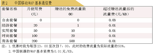 1X的優(yōu)勢是技術(shù)先進(jìn),速度快,但部分地區(qū)網(wǎng)絡(luò)覆蓋不足,開通國際漫游數(shù)據(jù)業(yè)務(wù)的國家少。此外,在收費上雙方也有不同。表2是中國移動與中國聯(lián)通WAP基本通信費比較(各省之間略有不同)。