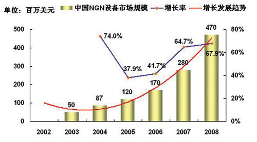 對(duì)于中國(guó)NGN市場(chǎng)規(guī)模的預(yù)測(cè),主要取決于各個(gè)運(yùn)營(yíng)商在NGN方面的戰(zhàn)略發(fā)展重點(diǎn),以及重點(diǎn)的投資方向。總體上來(lái)說(shuō),從2003年起,以IPTV、VOIP、寬帶接入等業(yè)務(wù)為代表的NGN的部分業(yè)務(wù)的推廣,使得事實(shí)上中國(guó)已經(jīng)形成一定的NGN的市場(chǎng)規(guī)模,盡管這一市場(chǎng)規(guī)模仍然很小。2004年中國(guó)的NGN基礎(chǔ)設(shè)備的市場(chǎng)規(guī)模超過(guò)8千萬(wàn)美元,以后隨著各個(gè)運(yùn)營(yíng)商N(yùn)GN戰(zhàn)略的進(jìn)一步清晰,這一部分的投資會(huì)保持持續(xù)穩(wěn)定的增長(zhǎng),2005~2008年以后的NGN設(shè)備投資規(guī)模的平均增長(zhǎng)率可以達(dá)到50%。