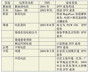 1999年,英國Video Networks公司率先在全球推出了IPTV業(yè)務(wù),此后,國外許多電信運營商先后進(jìn)入IPTV市場。但在2004年之前,多數(shù)運營商僅側(cè)重于IPTV的試驗,2004年后,IPTV開始從試驗階段向商用階段轉(zhuǎn)變,許多業(yè)界人士認(rèn)為,2005年將成為IPTV年。