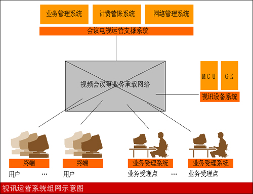 運(yùn)營(yíng)支撐系統(tǒng)的設(shè)計(jì)需要針對(duì)會(huì)議電視業(yè)務(wù)的特點(diǎn),為最終用戶提供方便、快捷的使用手段,同時(shí)為運(yùn)營(yíng)商提供全面、方便的管理功能,會(huì)議電視運(yùn)營(yíng)支撐系統(tǒng)主要包括業(yè)務(wù)管理、計(jì)費(fèi)營(yíng)賬、網(wǎng)絡(luò)管理等功能。完整的運(yùn)營(yíng)支撐系統(tǒng)需要考慮眾多的方面因素,如友好的操作界面、全面的可管理性、可維護(hù)操作性、有效的資源調(diào)度策略、靈活多樣的業(yè)務(wù)模式包括準(zhǔn)確實(shí)時(shí)的計(jì)費(fèi)統(tǒng)計(jì),都是其中非常重要的因素,缺一不可。右下圖為視訊運(yùn)營(yíng)系統(tǒng)的示意圖。
