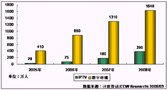 當(dāng)然,從國際上看,電信和廣電的融合是主流趨勢,但從目前國內(nèi)的情況來看,由于牽扯到利益沖突,融合并非一句話的事,仍需要克服重重阻力。計(jì)世資訊(CCW Research)的數(shù)據(jù)顯示,在2005年IPTV的用戶只有僅僅28萬人,而廣電數(shù)字電視用戶已經(jīng)達(dá)到410萬人。相信在未來幾年內(nèi)這個比例很難有大的變動。IPTV要想趕超數(shù)字電視還需要付出更大的努力。
