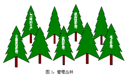 用“叢林”一詞來形容目前管理方法的林立,并沒有夸張的成份。在這片叢林中,許許多多根深葉茂的“參天大樹”不斷產(chǎn)生。許多專家學(xué)者把注意力集中于管理的某一方面,如質(zhì)量管理、流程再造、項(xiàng)目管理、供應(yīng)鏈管理等都體現(xiàn)了不同的管理視角。不同管理方法在理論緣由上相互促進(jìn)、相互影響,他們以各自不同的方式和視角描繪了管理的不同側(cè)面。