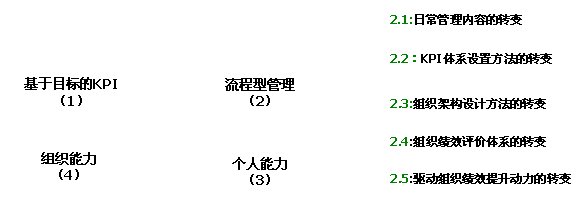 - KPI設(shè)置方法的轉(zhuǎn)變:將原來基于目標(biāo)的KPI轉(zhuǎn)變?yōu)榛诹鞒痰腒PI。原來基于目標(biāo)的KPI使員工工作目標(biāo)和流程不相關(guān),導(dǎo)致在日常工作員工對流程的不重視,因此,必須將原來基于目標(biāo)的KPI轉(zhuǎn)變?yōu)榛诹鞒痰腒PI,使目標(biāo)和流程相關(guān)聯(lián);