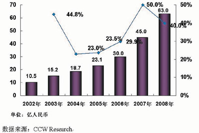 圖 2002—2008年中國視頻會議系統市場規(guī)模