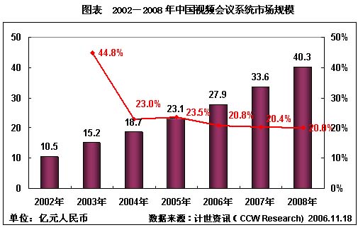 在2003年的井噴式發(fā)展之后,視頻會(huì)議系統(tǒng)市場(chǎng)發(fā)展速度開始進(jìn)入低速發(fā)展階段,市場(chǎng)逐漸出現(xiàn)飽和的趨勢(shì)。計(jì)世資訊(CCW Research)最新視頻會(huì)議報(bào)告數(shù)據(jù)顯示,從2003年非典時(shí)期視頻會(huì)議市場(chǎng)井噴式發(fā)展之后,2006年視頻會(huì)議系統(tǒng)的增長(zhǎng)率開始下降,如何開發(fā)新的產(chǎn)品,成為視頻會(huì)議系統(tǒng)市場(chǎng)繼續(xù)發(fā)展的關(guān)鍵。而3G商用的到來(lái),由此產(chǎn)生的移動(dòng)視頻業(yè)務(wù)也必將成為未來(lái)移動(dòng)通信新的市場(chǎng)增長(zhǎng)點(diǎn),可以說(shuō),移動(dòng)信息化建設(shè)將為視頻會(huì)議系統(tǒng)開拓一片新的藍(lán)海。