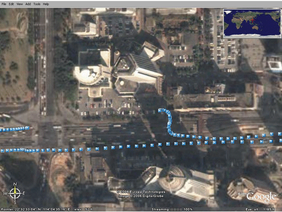 下圖顯示的是在中國(guó)深圳市進(jìn)行汽車試駕時(shí)的GPS數(shù)據(jù),利用的是Google earth應(yīng)用程序。圖中的每一個(gè)藍(lán)點(diǎn)代表一個(gè)GPS讀數(shù)。這些點(diǎn)在每隔一秒的時(shí)間內(nèi)讀出,因此,連續(xù)點(diǎn)之間的距離就代表著汽車的速度。我們甚至可以看見汽車駛?cè)氪髽堑耐\噲?chǎng)。
