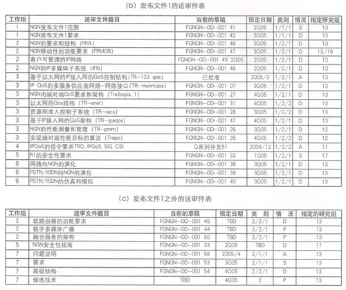 2005年5月之前,下一代網絡重點工作組已完成了計劃中的26個送審文件中的3個。所有的送審文件都必須指定專門的發(fā)布文件。遵循第13研究組的決定,下一代網絡重點工作組至少應完成發(fā)布文件1的送審稿。表2給出了下一代網絡重點工作組按發(fā)布文件分類的送審件。