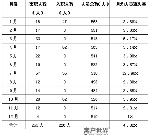 表一為該呼叫中心200X年全年的人員變動(dòng)情況表:
