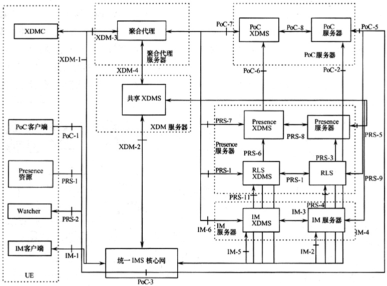 OMA雖然定義了XDM、Presence(呈現(xiàn))、Instant Message和PoC等業(yè)務(wù)的功能實體和參考點,但是為了在網(wǎng)絡(luò)中實現(xiàn)以上業(yè)務(wù),需要將OMA定義的功能實體和參考點映射成物理實體和協(xié)議,確定運(yùn)營商開放此類業(yè)務(wù)對設(shè)備和協(xié)議的要求,圖2給出了一種映射的方式。XDM服務(wù)器包含的共享XDMS功能提供公共群組的能力,有利于用戶在使用PoC、IM等業(yè)務(wù)時也能共享此群組。