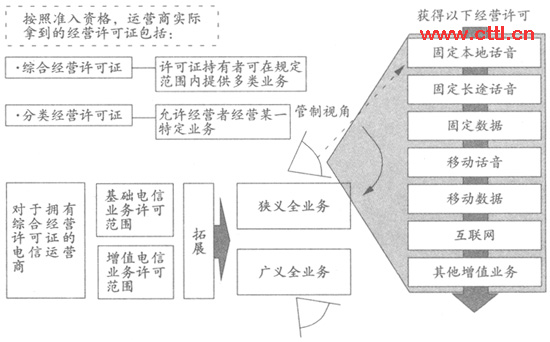 全業(yè)務(wù)可從電信管制、業(yè)務(wù)屬性及市場(chǎng)三個(gè)角度進(jìn)行定義。全業(yè)務(wù)運(yùn)營則可以從兩個(gè)角度來看待,一是從管制視角帶來的狹義全業(yè)務(wù);一是從多業(yè)務(wù)領(lǐng)域與電信結(jié)合的廣義全業(yè)務(wù)。具體表述可參照?qǐng)D1。