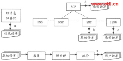 通過對移動點對點短消息計費原理的分析,可以把整個計費過程劃分為兩大環(huán)節(jié):計費點原始話單的生成和后期計費處理系統(tǒng)的處理。如果其中任何一個環(huán)節(jié)出現(xiàn)差錯都會降低用戶計費話單的準確性。因此在測試過程中采取了用戶層面和設(shè)備層面相結(jié)合的方法:一方面使用仿真儀表大量模擬點對點短消息的發(fā)送和接收,得到用戶話單;一方面分析各個計費點生成的原始話單。