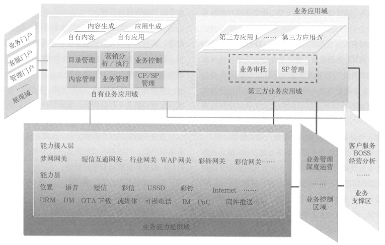 包括增值業(yè)務(wù)系統(tǒng)、業(yè)務(wù)接入網(wǎng)關(guān)系統(tǒng)等,該區(qū)域可根據(jù)業(yè)務(wù)功能細(xì)分為業(yè)務(wù)能力系統(tǒng)、業(yè)務(wù)能力接入系統(tǒng)。