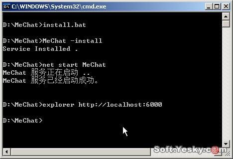 說明:MeChat目錄中還有一個Run、bat,該文件用于測試MeChat服務器。假如安裝MeChat時Run、bat的命令窗口還開著,則務必先關(guān)閉此窗口再執(zhí)行install、bat。另外,雙擊執(zhí)行該目錄下的uninstall、bat批處理文件可以停止并刪除系統(tǒng)中的MeChat服務。