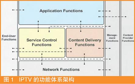 最終的IPTV的體系架構(gòu)與第六次會議的體系架構(gòu)沒有太大的差別,只是在細(xì)微之處進(jìn)行了細(xì)化和完善。IPTV的功能體系架構(gòu)包含7個部分:端用戶功能、應(yīng)用功能、業(yè)務(wù)控制功能、內(nèi)容分發(fā)功能、網(wǎng)絡(luò)功能、管理功能和內(nèi)容提供功能,如圖1所示。