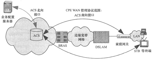 DSL Forum的終端管理模型如圖2所示,它確定了BOSS、ACS、DSLAM、家庭網關、終端設備的整體模型,被業(yè)界廣泛引用。