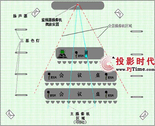 攝像機(jī)放置的最佳位置應(yīng)與監(jiān)視器的位置基本相同,揚聲器的位置可放置在會議室的四角,實際中常常是掛在四周的墻上。