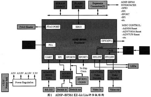 Blackfin561是Blackfin系列中的一款高性能定點DSP視頻處理芯片。其主頻最高可達750 MHz,其內核包含2個16位乘法器MAC、2個40位累加器ALU、4個8位視頻ALU,以及1個40位移位器。該芯片中的2套數(shù)據(jù)地址產(chǎn)生器(DAG)可為同時從存儲器存取雙操作數(shù)提供地址,每秒可處理1200M次乘加運算。芯片帶有專用的視頻信號處理指令以及100KB的片內L1存儲器(16 KB的指令Cache,16 KB的指令SRAM,64 KB的數(shù)據(jù)Cache/SRAM,4 KB的臨時數(shù)據(jù)SRAM)、128 KB的片內L2存儲器SRAM,同時具有動態(tài)電源管理功能。此外,Blackfin處理器還包括豐富的外設接口,包括EBIU接口(4個128 MB SDRAM接口,4個1MB異步存儲器接口)、3個定時/計數(shù)器、1個UART、1個SPI接口、2個同步串行接口和1路并行外設接口(支持ITU-656數(shù)據(jù)格式)等。Blackfin處理器在結構上充分體現(xiàn)了對媒體應用(特別是視頻應用)算法的支持。
