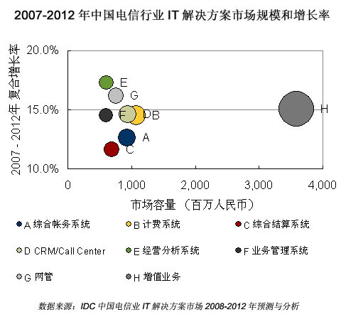 IDC預(yù)計,2007-2012年電信行業(yè)將注重運營支撐系統(tǒng)的全業(yè)務(wù)運營整合和支持前端業(yè)務(wù),因此3G增值業(yè)務(wù)、經(jīng)營分析系統(tǒng)、客戶關(guān)系管理系統(tǒng)、IT服務(wù)管理系統(tǒng)等建設(shè)將實現(xiàn)快速增長。已有項目仍然會持續(xù)升級維護(hù),以及配合全業(yè)務(wù)運營作出功能上的提升。2007年電信IT應(yīng)用解決方案(僅含解決方案供應(yīng)商自有軟件及其相關(guān)服務(wù)包括BSS/OSS/MSS/VAS)市場規(guī)模為97.27億元人民幣,占整體電信軟件和服務(wù)市場容量的74.5%。2012年電信行業(yè)IT解決方案整體市場規(guī)模將達(dá)到193.5億元人民幣。