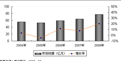 圖1 2004-2008年中國(guó)電信運(yùn)營(yíng)支撐系統(tǒng)市場(chǎng)規(guī)模及增長(zhǎng)