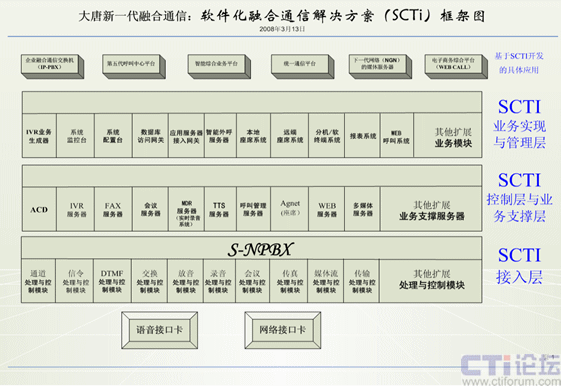 案例:我與大唐中聯(lián)(大唐融合)、和創(chuàng)世紀、華夏成訊等公司的技術(shù)開發(fā)人員經(jīng)過幾年來的摸索與實踐開發(fā),提出軟件化融合通信解決方案(SCTI)。通過計算機的軟件(通信服務(wù)系統(tǒng))來實現(xiàn)交換機上的所有通信功能,在互聯(lián)網(wǎng)上實現(xiàn)所有傳統(tǒng)通信網(wǎng)上的所有功能、還實現(xiàn)互聯(lián)網(wǎng)上的新的通信功能,在與傳統(tǒng)通信網(wǎng)上相連,只需增加一塊語音接口卡,就能實現(xiàn)互聯(lián)網(wǎng)與傳統(tǒng)通信的統(tǒng)一。此方案的成本比統(tǒng)一通信、融合通信等解決方案的成本要降幾十倍到上百倍。