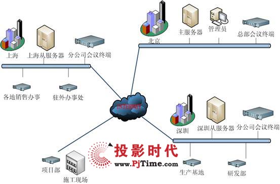 3臺(tái)高端專用服務(wù)器作為視頻會(huì)議服務(wù)器,可容納多點(diǎn)同時(shí)開會(huì),以確保系統(tǒng)的穩(wěn)定性和性能要求。主服務(wù)器放置在總公司,從服務(wù)器共2個(gè),分別放置在輻射分公司面大,位于分公司中心的兩個(gè)城市。所有接入的服務(wù)器和客戶端采用同一網(wǎng)絡(luò)服務(wù)商的線路。配置了使用1000M服務(wù)器專用網(wǎng)卡,以保證正常的音視頻信號的傳輸。并且將服務(wù)器放置在主干/核心交換機(jī)上,使服務(wù)器和客戶端的路由/交換性能達(dá)到最佳效果。其網(wǎng)絡(luò)拓?fù)鋱D如下:
