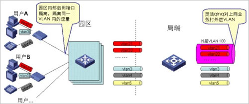 考慮到業(yè)務(wù)特性,上網(wǎng)業(yè)務(wù)通常需要對(duì)用戶進(jìn)行精細(xì)化管理,而對(duì)IPTV業(yè)務(wù)通常采用較粗獷的管理模式,因此我們建議通過(guò)如下方式來(lái)做VLAN規(guī)劃:對(duì)上網(wǎng)業(yè)務(wù),采用PUPV(每用戶一VLAN),對(duì)于IPTV/VOIP業(yè)務(wù),采用PSPV(每業(yè)務(wù)一VLAN),即同一園區(qū)內(nèi)的IPTV用戶采用同一VLAN,不同園區(qū)的IPTV/VOIP用戶采用不同的業(yè)務(wù)VLAN,在局端,通過(guò)靈活QINQ對(duì)上網(wǎng)業(yè)務(wù)的VLAN打外層標(biāo)簽,對(duì)于IPTV業(yè)務(wù)的VLAN不打外層標(biāo)簽。