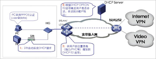 本方案中,上網(wǎng)業(yè)務(wù)采用PPPOE的認(rèn)證方式,IPTV業(yè)務(wù)可以采用PPPOE或DHCP+認(rèn)證。PPPOE認(rèn)證方式應(yīng)用已經(jīng)很廣泛了,在此不再贅述。