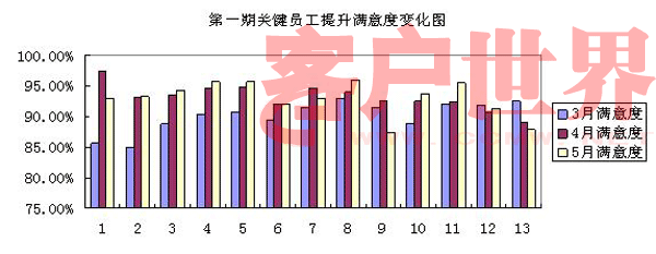 3-4月份的實施效果:13名客服代表的4月平均滿意度較3月份均值提升了3%,如下圖: