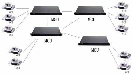 多MCU連接星型組網(wǎng)結(jié)構(gòu)見(jiàn)圖所示,其中VCT是視頻會(huì)議終端VideoConferenceTerminal的縮寫(xiě)