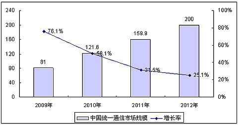 賽迪顧問預(yù)測,伴隨著全球經(jīng)濟的逐漸復(fù)蘇和企業(yè)對統(tǒng)一通信產(chǎn)品認識與需求的持續(xù)增長,2009年中國統(tǒng)一通信市場將出現(xiàn)加速增長的趨勢,全年市場規(guī)模將達81億元,同比增長76.1%,至2012年,中國統(tǒng)一通信整體市場規(guī)模將達200億元,平均年增長率超過30%。