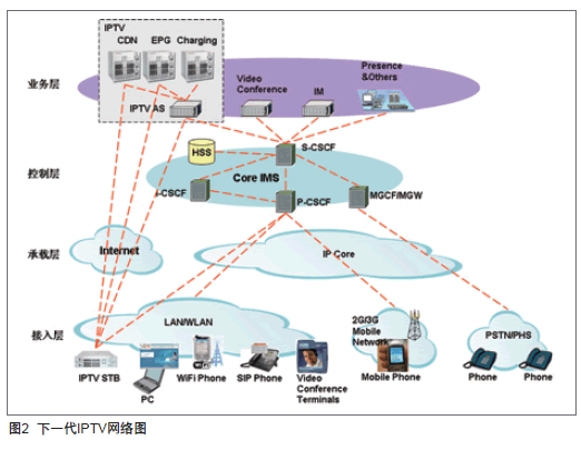 基于網(wǎng)絡(luò)視訊框架的下一代IPTV架構(gòu)堅持業(yè)務(wù)與網(wǎng)絡(luò)、信令與媒體相分離的設(shè)計思想,以IMS為交換核心網(wǎng),以APP應(yīng)用服務(wù)器為業(yè)務(wù)引擎,以CDN為媒體分發(fā)網(wǎng)絡(luò),兼容移動網(wǎng)絡(luò)、寬帶網(wǎng)絡(luò)和IMS/NGN網(wǎng)絡(luò),支持IPTV機頂盒、PC、智能終端,乃至3G終端(包含CS、PS域)等多樣化的類型終端,從而提供網(wǎng)絡(luò)電視、視頻點播、信息服務(wù)、PVR、TSTV、游戲、視頻通信等內(nèi)容豐富且無所不在的IPTV業(yè)務(wù)。