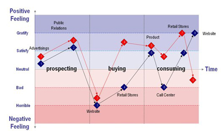 看一看“情感曲線”也許你就會(huì)頓悟。此處所示的兩條曲線來自兩個(gè)國際銀行。請(qǐng)注意曲線的不同之處。紅線所示的銀行與藍(lán)線所示的銀行相比在呼叫中心服務(wù)和店內(nèi)體驗(yàn)上都要略勝一籌。而藍(lán)線所示銀行在網(wǎng)上銀行這一項(xiàng)上表現(xiàn)更好。“紅線”銀行的競(jìng)爭(zhēng)資本是其卓越的客戶互動(dòng)體驗(yàn),無論是分行的面對(duì)面互動(dòng)還是來自聯(lián)絡(luò)中心的遠(yuǎn)程體驗(yàn)都屬一流。