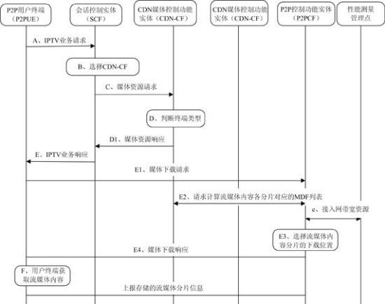 本架構的最大特點是結合CDN和NGN架構(注:為了簡化沒有給出詳細的NGN相關控制實體,架構中只體現(xiàn)了會話控制實體和資源接納控制功能實體),在此基礎上引入P2P相關功能,包括P2P控制實體和P2P用戶終端。通過對基于NGN的IPTV架構和CDN架構的改進,使該架構既能夠具備電信網(wǎng)中網(wǎng)絡資源可控、可管的特征,又通過引入P2P具備了一定的靈活性和自組織能力,將電信網(wǎng)和互聯(lián)網(wǎng)技術的優(yōu)勢均集中在了一起。