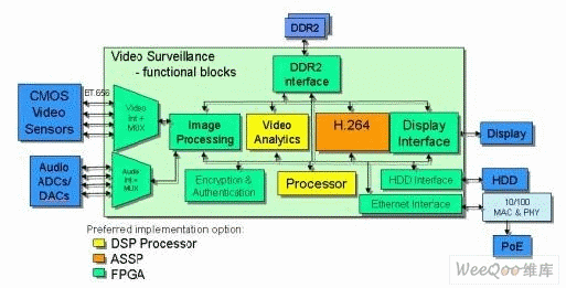經(jīng)過壓縮后的數(shù)據(jù)通過硬盤驅(qū)動器接口存儲至視頻存儲服務器,或通過以太網(wǎng)網(wǎng)絡發(fā)送。視頻數(shù)據(jù)傳送到顯示器之前通常是取自硬盤驅(qū)動器,并經(jīng)過了解碼以及一些圖像后處理,如縮放、色彩空間轉(zhuǎn)換或覆蓋應用。通常情況下,存儲器接口(如DDR2)是用來存儲視頻幀。此外,某些系統(tǒng)要求視頻內(nèi)容的實時加密以確保安全和源/用戶身份驗證。最后,需要用處理器控制和協(xié)調(diào)/排定各種不同的任務。