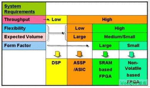 但是ASIC和ASSP帶來了高昂的非重復性工程費用成本,除非批量非常大。如果只有一小部分用戶使用特殊的功能模塊,那么FPGA解決方案可提供更好的回報。對于ASIC和ASSP,這些器件有限的功能和固有的不靈活性,不允許在設(shè)計完成后根據(jù)市場的要求改進或添加新的功能。FPGA卻能提供廣泛的功能和高度的靈活性。