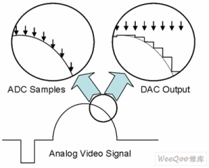 由攝像機或其他設備捕獲的模擬視頻信號通過模/數轉換器(ADC)進行數字化處理,它在每個時鐘邊沿即時記錄數據(圖2)。模擬信號連續(xù)變化,而轉換成數字信號時則是定時采樣。經過數字處理和傳輸后,數字信號通過數/模轉換器(DAC)轉變成模擬信號。DAC的輸出如圖2的右上角所示,箭頭代表時鐘信號。