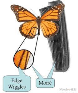 為了反映鏡像邊帶沒有衰減的效果,圖3b和3c示意了奈奎斯特頻率和時鐘頻率處的頻譜重疊。這些疊加的鏡像邊帶信號(圖3d)與視頻信號相比具有隨機的相位差。圖4表示我們需要避免的圖像誤差!斑吘墧[動”是高頻邊緣干擾,它重疊在視頻信號上,具有隨機變化的相位。摩爾效應是時鐘、視頻信號頻率之間相互作用的結果。