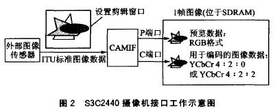 YCbCr8比特標(biāo)準(zhǔn)的圖像數(shù)據(jù)輸入,最大可采樣4096×4096像素的圖像。攝像頭接口可以有兩種模式與DMA控制器進(jìn)行數(shù)據(jù)傳輸:一種是P端口模式,把從攝像頭接口采樣到的圖像數(shù)據(jù)轉(zhuǎn)為RGB數(shù)據(jù),并在DMA控制下傳輸?shù)絊DRAM(一般這種模式用來(lái)提供圖像預(yù)覽功能);另一種是C端口模式,把圖像數(shù)據(jù)按照YCbCr4:2:0或4:2:2的格式傳輸?shù)絊DRAM(這種模式主要為MPEG-4、H.263等編碼器提供圖像數(shù)據(jù)的輸入)。上述兩種工作模式都允許設(shè)置一個(gè)剪輯窗口,只有進(jìn)入這個(gè)窗口的圖像數(shù)據(jù)才能夠傳輸?shù)絊DRAM。上述過(guò)程可用圖2說(shuō)明。