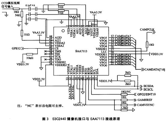 SAA7113 的CE 引腳與S3C2440 的一個(gè)GPIO 引腳相連,這樣可以控制SAA7113的工作狀態(tài)。當(dāng)無(wú)須采集圖像時(shí),將該GPIO口輸出低電平,使SAA7113芯片處于低功耗狀態(tài),節(jié)省電能的消耗。對(duì)照?qǐng)D2和圖3可以看出,SAA7113芯片就是圖2的“外部圖像傳感器”。它向嵌入式系統(tǒng)的攝像機(jī)接口提供了采樣到的標(biāo)準(zhǔn)ITU視頻數(shù)據(jù)。這些數(shù)據(jù)經(jīng)過(guò)DMA的P端口或C端口控制傳輸?shù)搅藘?nèi)存,這樣就可以在內(nèi)存中對(duì)圖像數(shù)據(jù)作進(jìn)一步的加工處理。