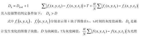 敏感項,α為抑制系數(shù),N為檢測區(qū)域內(nèi)的像素數(shù)目。采用這種塊比較法,閾值取值范圍大大減小,易于確定,而且對運動目標(biāo)的大小也有一定的選擇性。在檢測每一子塊圖像是否發(fā)生變化時,引入光照敏感項,避免了因光照變化引起的虛警。這種方法對光線變化有一定的自適應(yīng)性,擴展了系統(tǒng)的動態(tài)適用范圍。