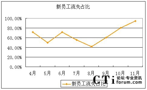 而對(duì)流失員工的結(jié)構(gòu)性分析我們發(fā)現(xiàn),4-11月期間新員工流失占總體流失人數(shù)的比例在不斷上升,4-8月基本在50%上下波動(dòng),而從9月份開(kāi)始直線上升,到11月份更達(dá)到了占到流失總?cè)藬?shù)的94.12%。當(dāng)月有16名入職不到三個(gè)月的新員工離職,而老員工只有1人離職。