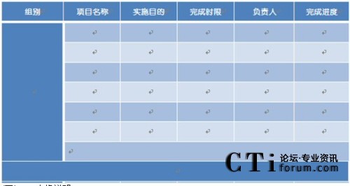 表格內(nèi)容包括:規(guī)劃實(shí)施項(xiàng)目的名稱、目的、完成時(shí)限要求、負(fù)責(zé)人員及進(jìn)度等。