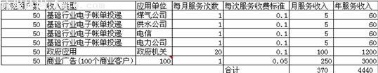 那么如果一家運(yùn)營商已經(jīng)設(shè)計(jì)出了符合市場需求的業(yè)務(wù)模式,未來的盈利前景將會怎樣呢?不妨讓我們模擬分析一下。假設(shè)一個運(yùn)營商擁有50萬左右的城市家庭用戶。在基礎(chǔ)行業(yè)領(lǐng)域,每月可以幫助煤氣、供水、電信和電力公司各發(fā)送1次賬單;在商業(yè)客戶方面,擁有百家左右的合作伙伴,每月每家合作伙伴發(fā)送1條短信廣告;在政府機(jī)關(guān)領(lǐng)域,粗略估算政府機(jī)關(guān)每月總計(jì)使用20次左右;每個家庭用戶則每月收到電信短信約125條。假設(shè)運(yùn)營商的服務(wù)資費(fèi)中,除了商業(yè)廣告為0.05元/條外,均為0.1元/條。那么,盈利情況又該怎樣呢?