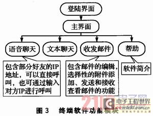用戶(hù)打開(kāi)終端軟件,可以根據(jù)自己的需要選擇語(yǔ)音聊天、文本聊天或者收發(fā)郵件。進(jìn)行語(yǔ)音聊天前,用戶(hù)可以直接在好友欄中選擇聊天對(duì)象,也可直接輸入對(duì)方的IP進(jìn)行連接。語(yǔ)音聊天的過(guò)程是:說(shuō)話(huà)方,麥克風(fēng)采集模擬語(yǔ)音信號(hào)→語(yǔ)音芯片采集量化編碼→嵌入式系統(tǒng)對(duì)信號(hào)進(jìn)行壓縮編碼→RTP格式打包→UDP格式打包→IP格式打包→Internet網(wǎng)絡(luò)傳輸;收聽(tīng)方,接收語(yǔ)音數(shù)據(jù)→去IP/UDP/RTP包頭→嵌入式系統(tǒng)對(duì)信號(hào)解碼→語(yǔ)音芯片將數(shù)字語(yǔ)音信號(hào)轉(zhuǎn)為模擬信號(hào)→揚(yáng)聲器播放。