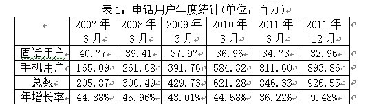 政府對電信市場的開放不僅帶來了電信產(chǎn)業(yè)的快速發(fā)展,激烈的競爭也令消費者享受到性價比更高的服務(wù)。近幾年,電話用戶總數(shù)持續(xù)增長,從1999年的2281萬增加到2011年3月底的8億4633萬。截至2011年12月31日,電話用戶總數(shù)達到9億2655萬,說明從2011年4-12月期間新增用戶8022萬。其中,手機用戶數(shù)增長最為顯著,從2007年的1億6509萬增加到2011年3月的8億1160萬,2011年12月底達到8億9386萬。但是,固話用戶的數(shù)量則從2007年的4077萬減少到2011年3月的3473萬,到2011年12月僅有3269萬。(見表1)