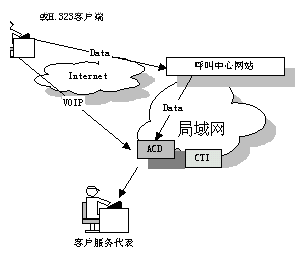 國際上一些先進(jìn)的 呼叫中心產(chǎn)品供應(yīng)商現(xiàn)在已經(jīng)把 Web 技術(shù)引入到他們的產(chǎn)品中了。通過屏幕上的一個按鈕可以利用 Internet 電話把客戶和呼叫中心連接起來。客戶使用一個很普通的帶有麥克風(fēng)﹑聲卡以及傳輸速率不小于 28.8 kbps 的Modem 的多媒體 PC 機(jī),并配有 Web 瀏覽器以及與 H.323兼容的應(yīng)用軟件就可以利用把他們連接到 Web 站點的那條電話線與呼叫中心的座席員交談。其簡單示意圖如下: