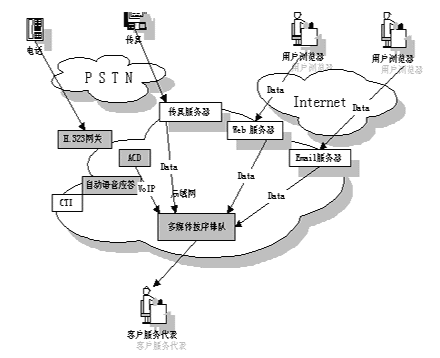 多媒體呼叫中心實際上是基于CTI 技術(shù)的傳統(tǒng)呼叫中心與 ICC 的相互結(jié)合,F(xiàn)在許多呼叫中心把各種媒體通信技術(shù)集成到了一起,允許座席員同時可以處理語音呼叫﹑Web請求﹑e-mail和傳真。其簡單示意圖如下: