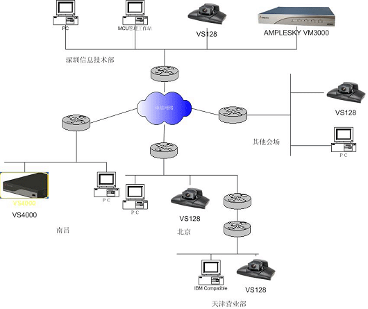 整個系統(tǒng)構(gòu)建在江南證券有限責(zé)任公司廣域網(wǎng)上,江南證券有限責(zé)任公司廣域網(wǎng)骨干帶寬為512K,江南證券有限責(zé)任公司視頻會議系統(tǒng)可以使用足夠的帶寬。江南證券有限責(zé)任公司視頻會議系統(tǒng)拓?fù)鋱D結(jié)構(gòu)如下: