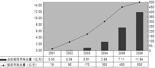 有數(shù)據(jù)顯示,2002年企業(yè)短信市場(chǎng)總量為0.09億元,2003年增長(zhǎng)到0.81億元,預(yù)計(jì)2006年將突破10億元。終于,中國(guó)移動(dòng)和中國(guó)聯(lián)通先后推出了面向企業(yè)用戶的“集團(tuán)短信”業(yè)務(wù),運(yùn)營(yíng)商對(duì)這個(gè)市場(chǎng)的重視使得一個(gè)新的產(chǎn)業(yè)鏈逐步完善起來,短信也開始“潤(rùn)物細(xì)無聲”地改變著國(guó)內(nèi)企業(yè)的一些習(xí)慣。