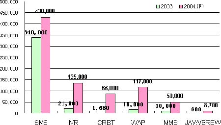 短信業(yè)務(wù)是各類移動(dòng)增值業(yè)務(wù)中用戶量最多的新業(yè)務(wù),2003年已達(dá)到1.4億,WAP、IVR和CRBT業(yè)務(wù)2004年都取得高速增長(zhǎng)。其中WAP用戶規(guī)模達(dá)到2500萬(wàn),其市場(chǎng)規(guī)模由2003年的1.8億元增長(zhǎng)為2004年的11.7億元。